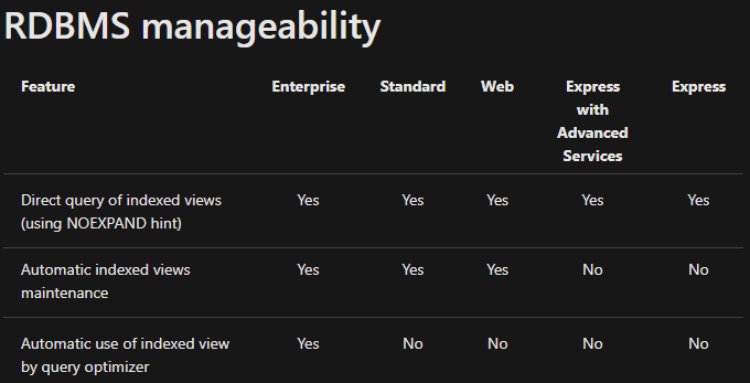 See the consolidated screenshot taken from the SQL Server 2019 editions and supported features page for some edition to edition indexed view differences: