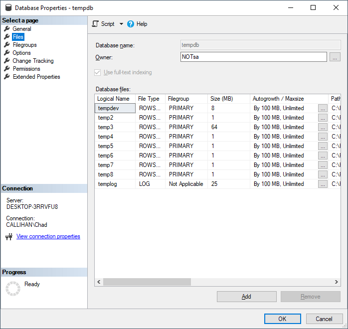 One setting to consider when configuring tempdb is autogrowth. You’ll want to make sure that each of the data files are set to grow consistently. You don’t want a mix of files growing by 10% while others grow by 10MB.