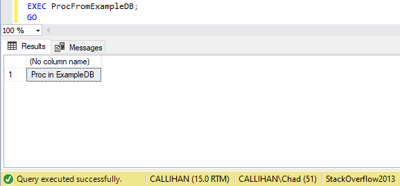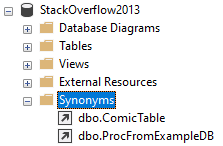 We’ll create a couple synonyms in the StackOverflow2013 database to use objects in the ExampleDB database on the same server.