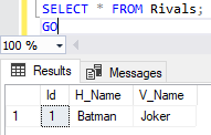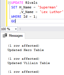 How do we get passed this error? One solution is to add an INSTEAD OF UPDATE trigger. We’ll use this trigger to update Hero with the new Hero name and Villain with the new Villain name: