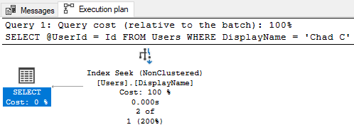 Instead of throwing an error, our script…worked? Yes and no. We didn’t get an error message but we don’t know the value of @UserId yet. If we check the execution plan, we see “2 of 1” on the index seek: