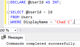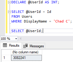 What if we need to retrieve information for the user record with a “Chad C” DisplayName value from the StackOverflow2013 database? For the sake of this example, we’ll expect the Users table to only have one “Chad C” user. Let’s begin by declaring a variable and using SET to set the value.