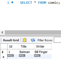 I created a local example database called exampledb with a table called Comic. Let’s say we want to connect to MySQL and insert a new record.