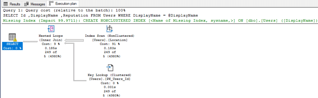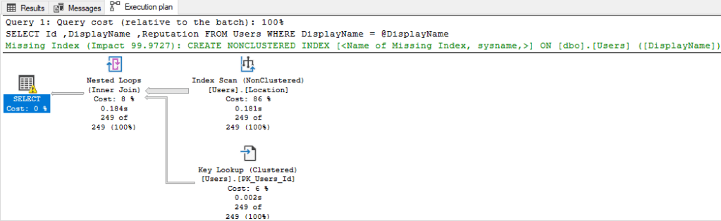 If we execute that procedure and check the execution plan, we’ll see that an index can improve performance: