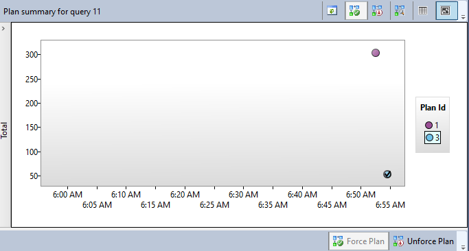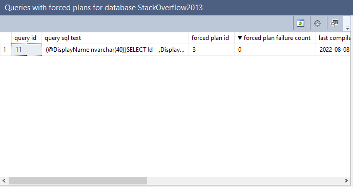 Refreshing the Queries With Forced Plans pane will confirm that the “old” plan, Plan Id 1, was used instead of our forced plan: