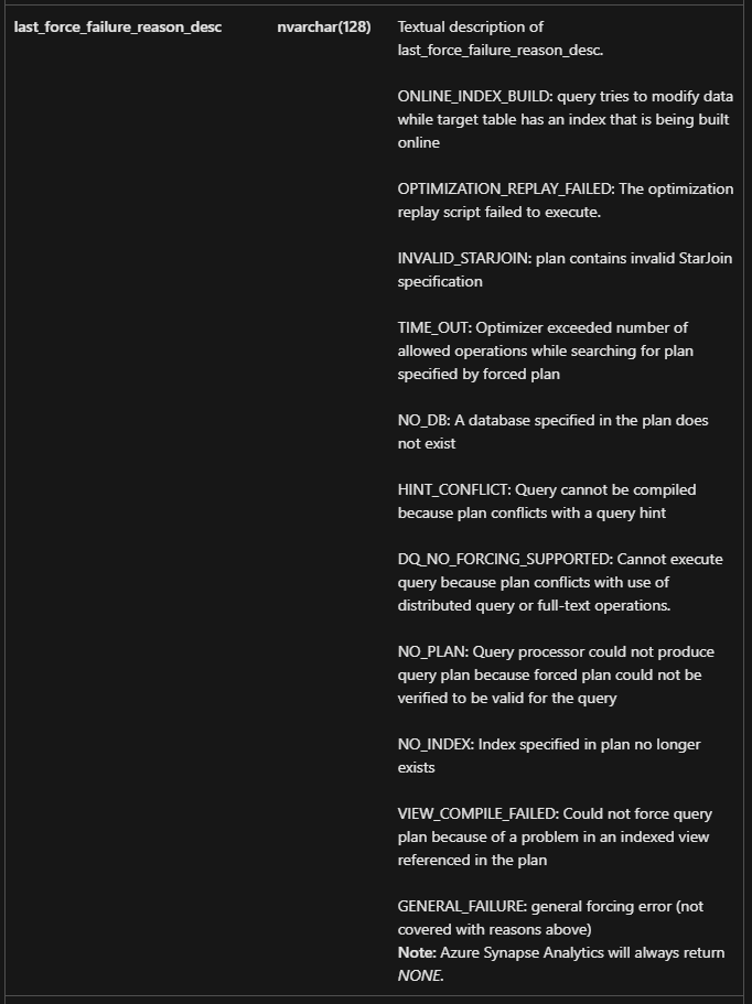 A missing index isn’t the only reason a forced plan can fail. Below is a list from Microsoft’s sys.query_store_plan page showing what last_force_failure_reason_desc values you can possibly see in sys.query_store_plan: