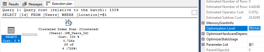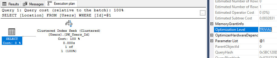 We can check Properties again and see that this query had a trivial plan. All we have in our execution plan is a clustered index seek.