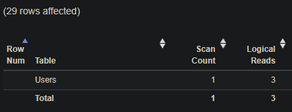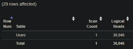The query completed it under a second and had 30046 logical reads scanning the PK_Users_Id index.