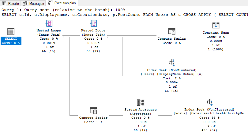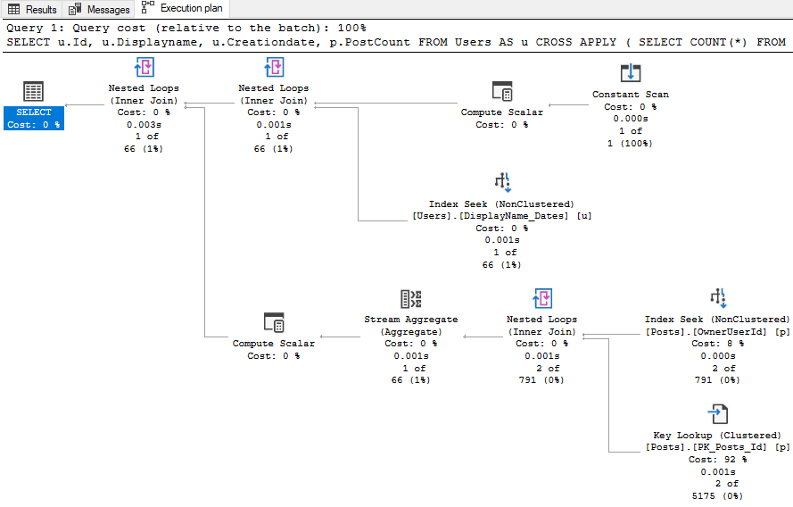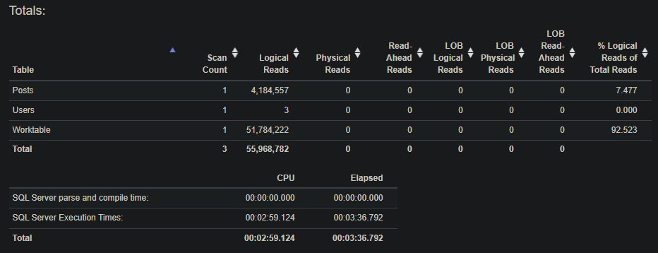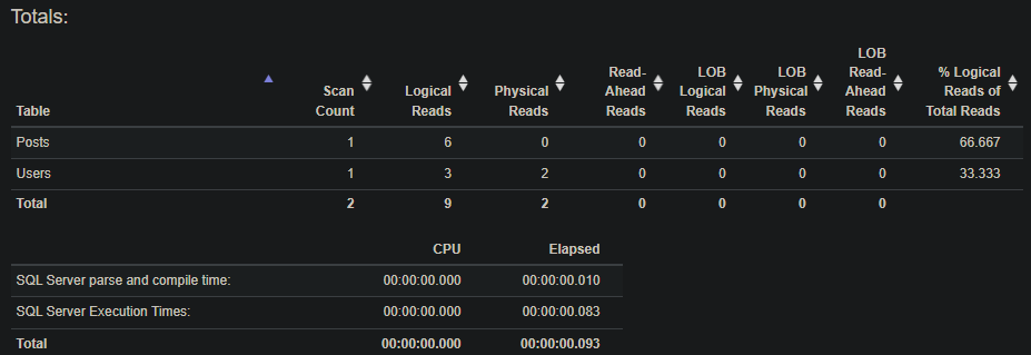 The first part that jumps out is OwnerUserId on the Posts table which we do not have an index for. For the sake of testing, let’s add an index on OwnerUserId: