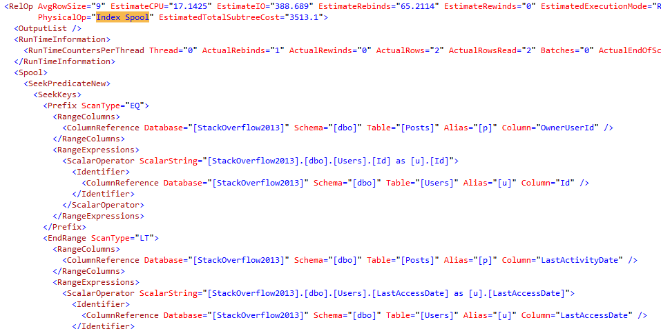 We have no missing index recommendations; however, highlighted is the Eager Index Spool which tells us we can probably improve our performance with an index. Let’s take a look at the XML of the plan to see more details on the eager index spool.