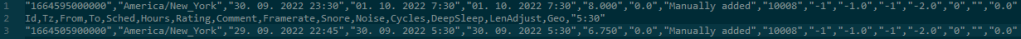 If I export all of my sleep records from the app to a CSV file, I get a set of data looking something like this: