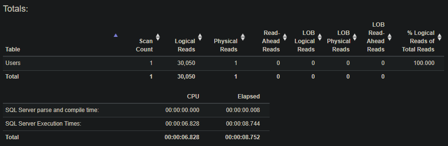 Plugging our stats into StatisticsParser shows us we had 30,050 logical reads which took almost 9 seconds to complete: