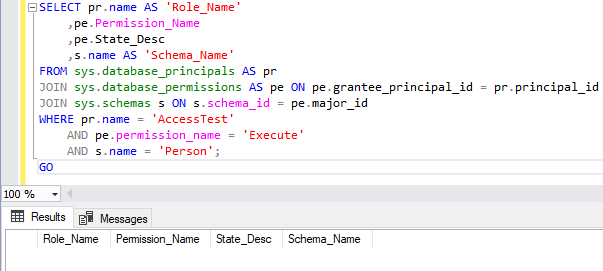 Nothing returned, which indicates our AccessTest user doesn’t have EXECUTE permissions on Person yet.