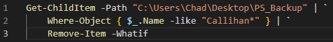 Let’s say we’re done working with the Callihan SQL Server backup files and it’s time to delete them. We know our backups to delete are stored in “C:\Users\Chad\Desktop\PS_Backup” so we write the following script in PowerShell and add Whatif to check our work: