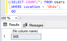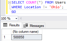 We only have 648 Ohio records. But here is where things can potentially get tricky. If we make a small change to that query to find Users NOT in Ohio, we’ll get the following: