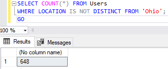 If we search for Users where the Location IS DISTINCT FROM Ohio, we’ll see a higher number than before: