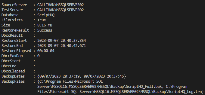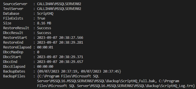 Test-DbaLastBackup -SqlInstance CALLIHAN\MSSQLSERVER02 -Database ScriptHQ