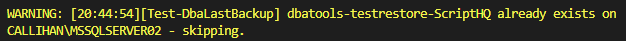 If you do this, make sure to drop your test restore database before you run Test-DbaLastBackup again. If Test-DbaLastBackup runs but finds the test restore database, it will give you a warning and skip doing any restores or checks.