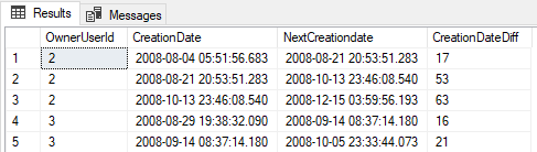 SELECT OwnerUserId, CreationDate, NextCreationdate, DATEDIFF(DAY, CreationDate, NextCreationdate) AS 'CreationDateDiff'