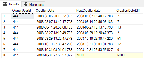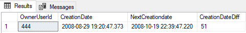 Let’s pick out an OwnerUserId and confirm our dates line up. We’ll change our subquery to only show OwnerUserId 444 regardless of the CreationDateDiff: