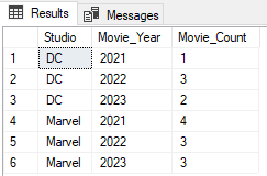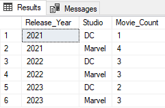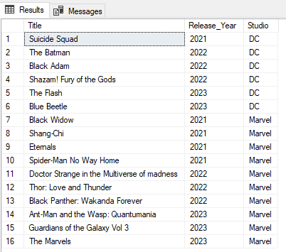 Let’s say we have a table of movies released by DC and Marvel. We’ll focus on movies released in 2021 through 2023 and use this data as we test: