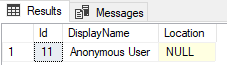 Let’s test out how a query performs with ANSI_NULLS set to ON and how that compares to when ANSI_NULLS is set to OFF. Using the Stackoverflow2013 database, we’ll run a query to give us the Id, DisplayName, and Location for the user with an ID of 11.