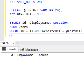 Since ANSI_NULLS is set to OFF, SQL Server evaluates the WebsiteUrl = @TestUrl as TRUE and returns our result. What if we set ANSI_NULLS to ON and run the same query again?