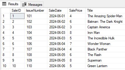 Let’s set up a table of test data in a ComicSales table. Yes, SalePrice is just an INT rather than something more precise like DECIMAL. More on that later. For now, here’s our test data: