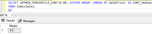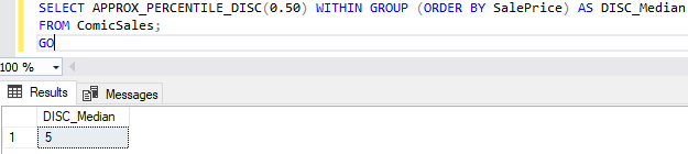 Unlike APPROX_PERCENTILE_CONT, APPROX_PERCENTILE_DISC will always return a SalePrice that exists in our ComicSales table. If we use APPROX_PERCENTILE_DISC to find the median by once again specifying 0.50, we’ll get 5. This is the actual price for the “Incredible Hulk” and “Green Lantern” comics.