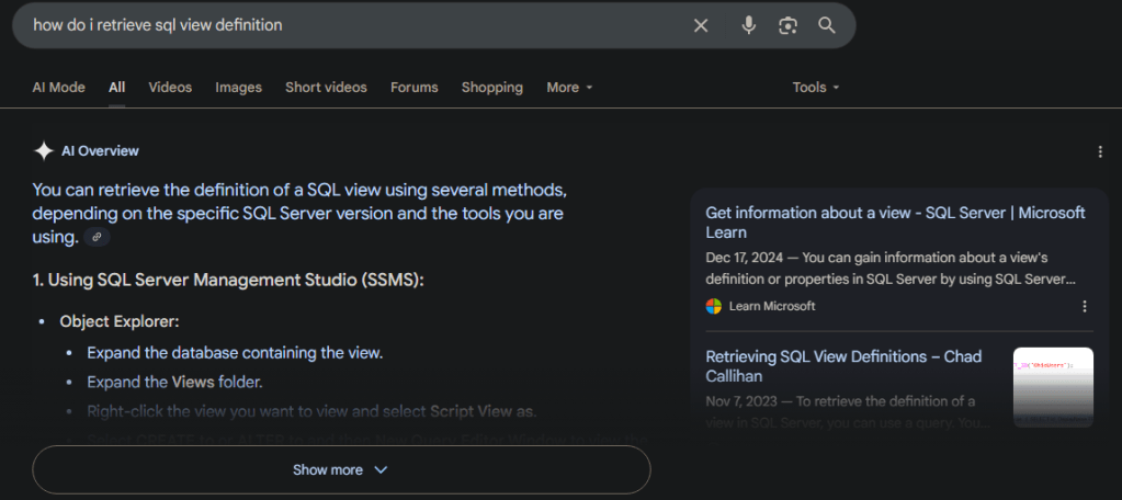 For example, let’s say I want to find how to retrieve SQL view definitions. If I search Google, I get the following result: