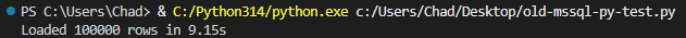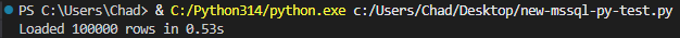 Now let’s try the “new” way. With the new mssql-python 1.4.0, we can now utilize bulk copy (BCP), which should speed things up quite a bit. Let’s find out how much by running this script: